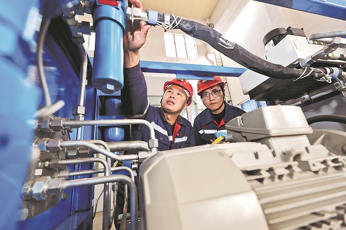圖為淮北礦業集團楊柳煤礦特級技師、保運一區運轉隊副隊長范興輝(左一)在檢修設備。