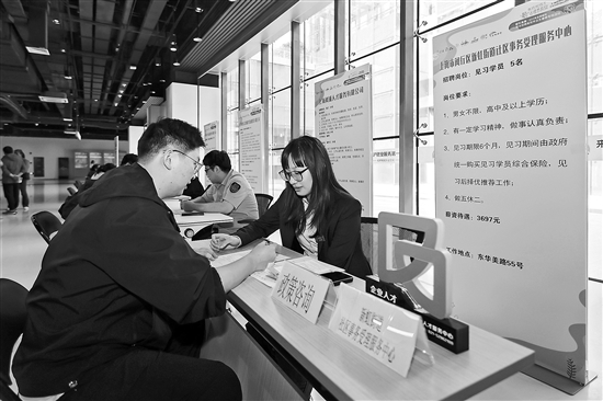 4月8日,求職者(左)在招聘會(huì)現(xiàn)場(chǎng)咨詢就業(yè)政策。當(dāng)日,上海虹橋樞紐樂業(yè)空間舉行4月首場(chǎng)招聘會(huì)。該平臺(tái)提供“一站式”就業(yè)服務(wù),自運(yùn)營(yíng)以來,累計(jì)完成求職登記200余人次,接聽就業(yè)咨詢電話600余通,舉辦就業(yè)指導(dǎo)服務(wù)活動(dòng)17場(chǎng),服務(wù)群眾超3000人次。 新華社記者 王翔 攝