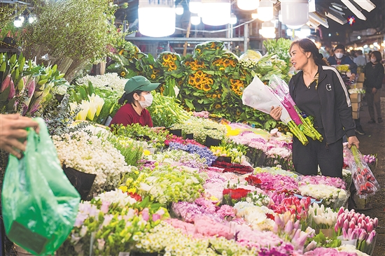 扎根花卉行業14年的越南老街花商阮翠云,自2018年起將云南花卉銷往越南。隨著網絡銷售平臺的興起,她積極與鮮花電商平臺合作,如今從采購到物流均可在線完成。通過快捷的物流網絡,云南的玫瑰、百合等主力品種次日便能從田間地頭抵達越南河內的花市貨架,完成一場跨越國界的“芬芳之旅”。如今,阮翠云平均每月會乘坐動車從河口到昆明進行采購,她創立的公司通過老街口岸,將云南優質花卉運往河內、胡志明等越南城市,讓七彩“云花”成為越南家庭的常客。圖為近日,一名女子在越南河內廣霸花市購買鮮花。
