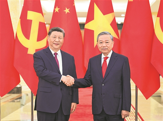 習近平指出,很高興對越南進行國事訪問,實現(xiàn)同蘇林總書記的首輪互訪。今年是越南共產(chǎn)黨成立95周年、越南建國80周年和南方解放50周年,我代表中國共產(chǎn)黨和中國政府向越方致以熱烈祝賀。中方將一如既往支持越南走好符合本國國情的社會主義道路,勝利召開2026年越共十四大,朝著建黨建國“兩個一百年”奮斗目標不斷邁進。