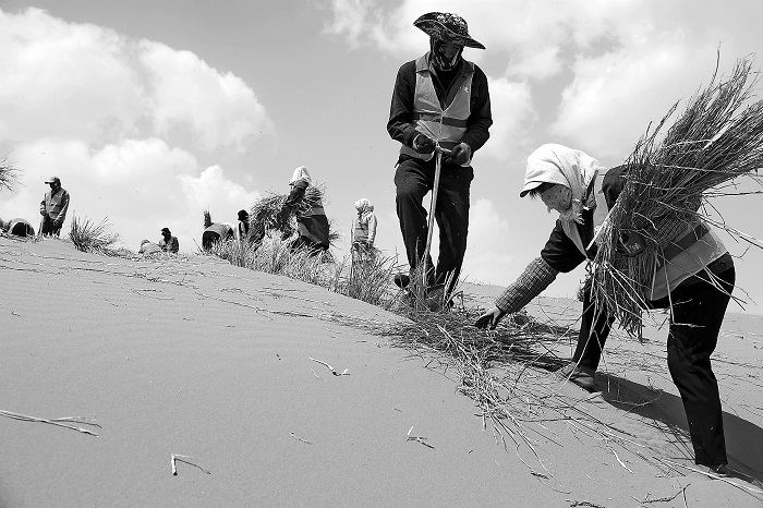 4月10日,位于內蒙古自治區阿拉善盟的巴丹吉林沙漠內,來自中建一局的工作人員正在鋪設草方格為補種花棒做準備。