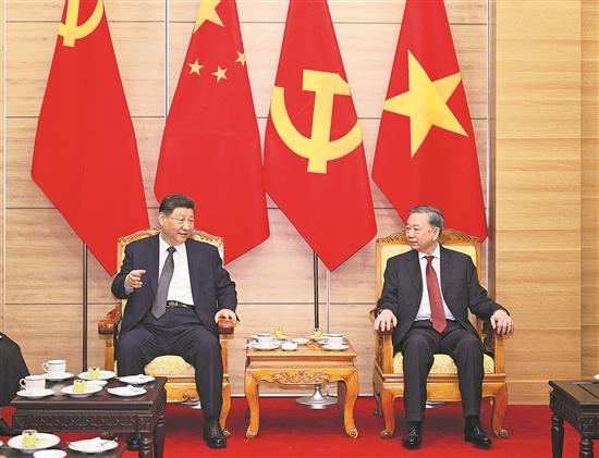 習近平指出,這次訪問時間雖短,但活動豐富、成果豐碩。雙方重申共同壯大世界社會主義事業的政治意愿,都期待朝著“六個更”總體目標全面推進兩國戰略合作,都表示抵御外部風險挑戰,維護地區和平穩定和國際公平正義。我對中越關系發展前景充滿信心。雙方要全面落實這次訪問成果,持續推進中越命運共同體建設。