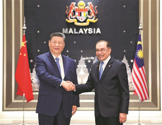 二是凝聚發展合力,打造高質量發展合作標桿。中國致力于以高質量發展全面推進中國式現代化,同馬來西亞“昌明經濟”計劃異曲同工。雙方要攜手培育壯大數字經濟、綠色經濟、藍色經濟、人工智能等前沿合作,加強產業鏈、供應鏈、價值鏈、數據鏈、人才鏈融合發展。推動傳統領域合作轉型升級,促進雙向投資。推進鐵海聯運,實現“兩國雙園”提質升級,將馬來西亞重要港口打造成“陸海新通道”重要樞紐。