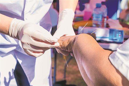 近日,在莫桑比克馬托拉市,第25批中國援莫醫療隊的醫生使用針灸療法為當地居民義診。新華社記者 劉杰 攝
