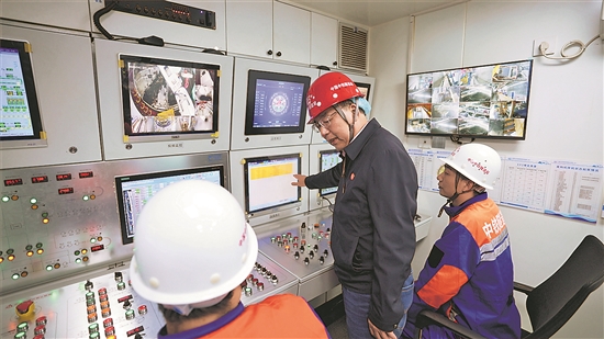 圖為洪開榮在“領航號”盾構機中控室內就智能掘進情況與現場技術人員交流。楊婷堯 攝