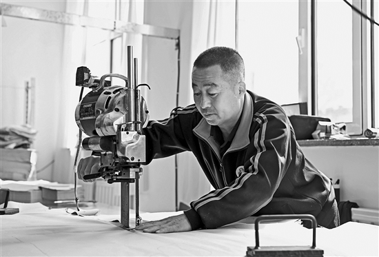4月16日,殘障人士在內蒙古鄂爾多斯市東勝區殘疾人輔助性就業基地裁剪布料。近年來,鄂爾多斯市積極建設無障礙環境,進一步提升針對殘障人士的康復、教育、輔助性就業等方面的服務水平,多措并舉關愛殘障人士。 新華社記者 貝赫 攝