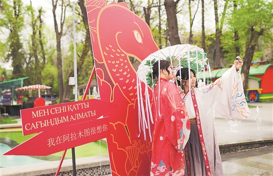 “國際中文日”慶祝活動近日在哈薩克斯坦阿拉木圖中央休閑公園舉辦。本次活動以“中文:穿越時空的禮物”為主題,設置了包括書法、國畫、漢服打卡等中國文化體驗活動,以及古箏演奏、互動游戲等。中哈政商學界代表、文化團體、中文專業師生代表和中國文化愛好者歡聚一堂,感受中華文化之美。圖為近日在哈薩克斯坦阿拉木圖,人們在“國際中文日”慶祝活動上留影。新華社記者 李任滋 攝