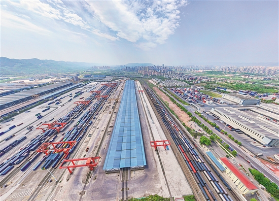 圖為4月17日在重慶國際物流樞紐園區拍攝的團結村中心站、興隆場編組站和陸海新通道重慶無水港(從左至右,無人機照片)。