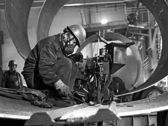 塔筒由一片片寬大的鋼板經過多道精密工藝程序加工而成,原材料被送到生產車間后,經過下料、卷制、組對、焊接、檢測、防腐和內件安裝,最終被制為成品,生產周期在15天左右。圖為車間工人正在加工塔筒。