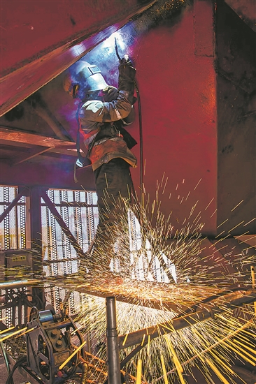 圖為4月14日,工人在腳手架上焊接物料溜槽。蔣曉東 攝