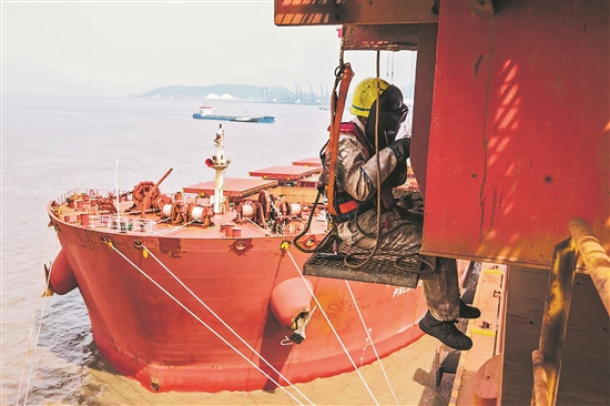 圖為4月11日,修理三班職工吳龍在30余米高空焊修卸船機。蔣曉東 攝