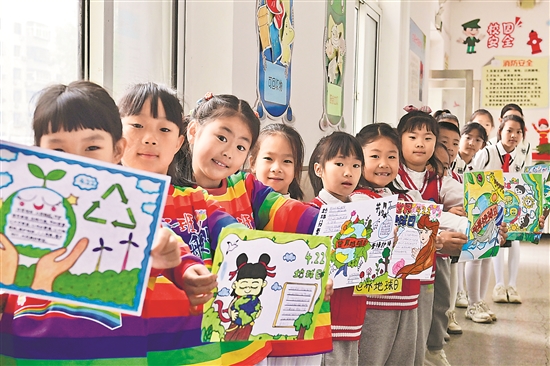 4月22日,沈陽市鐵西區保工二校學生展示自己制作的世界地球日主題手抄報。當日是世界地球日,各地開展形式多樣的主題活動。新華社記者 吳青昊 攝