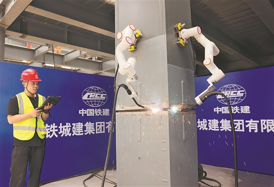 4月21日,在中鐵城建集團湘江科學城交易展示中心項目施工現場,一款輕量化智能焊接機器人在技術人員的操控下正在進行焊接施工。