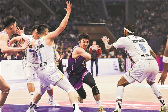 圖為北京控股隊員(紫衣)持球突破北京北汽隊員。本報記者 王偉偉 攝