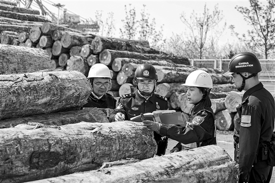 近日,在山東港口日照港嵐山港區,日照出入境邊防檢查站民警和日照海關查驗關員聯合查驗進口原木。