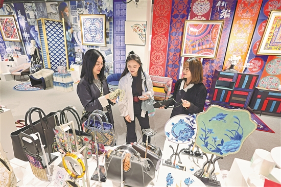 4月24日,北京市豐臺區的一家服飾公司內,工作人員正在向顧客介紹采用傳統紋樣設計的服飾及文創產品。