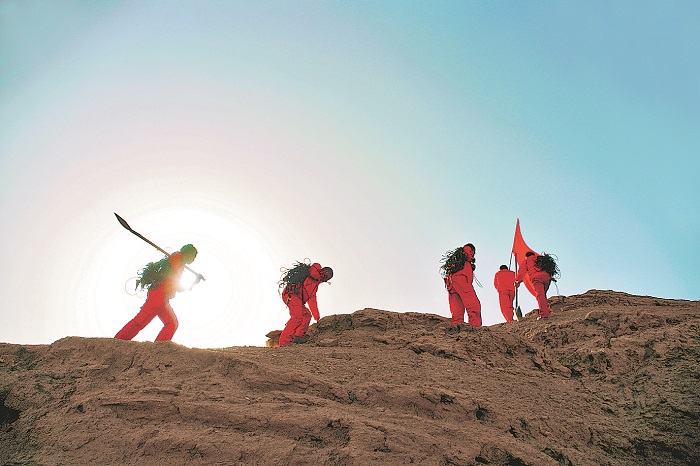 中石化地球物理公司華東分公司SGC2121隊承攬的新疆塔西南巴麥—和田地震資料采集項目,面臨測線跨度大、地表類型雜、地表障礙多、施工周期短、各類資源緊五大難題。放線班通過優(yōu)化“滾動式、分散式、單元式”生產(chǎn)模式,快速完成放線任務。圖為近期山地攻堅隊員背負設備開展放線作業(yè)。吳奇杰 吳佳倬 吳孔明 攝