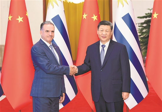 習(xí)近平強(qiáng)調(diào),中烏兩國要繼續(xù)堅定支持彼此核心利益和重大關(guān)切,密切各層級、全方位友好交往,加強(qiáng)治國理政經(jīng)驗交流,不斷深化戰(zhàn)略互信。中共二十屆四中全會通過“十五五”規(guī)劃建議,為未來5年中國經(jīng)濟(jì)社會發(fā)展擘畫藍(lán)圖,也為包括烏拉圭在內(nèi)的各國提供更多機(jī)遇。雙方要加強(qiáng)發(fā)展戰(zhàn)略對接,深化經(jīng)貿(mào)、金融、農(nóng)牧業(yè)、基礎(chǔ)設(shè)施建設(shè)、信息通信等合作,挖掘綠色發(fā)展、數(shù)字經(jīng)濟(jì)、人工智能、清潔能源等新興領(lǐng)域合作潛力,推動經(jīng)濟(jì)增長轉(zhuǎn)型升級。中國和烏拉圭人民有著天然親近感,雙方要持續(xù)深化文化、教育、體育、媒體、地方等交流,便利人員往來,促進(jìn)民心相通。