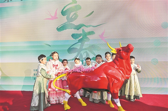 2月4日,“春姑娘”“牛童”手持花枝鞭打春牛。當日是立春,北京市東城區(qū)建國門街道第十九屆立春文化活動在北京古觀象臺舉行。活動重點展示立春時節(jié)“打春牛”等傳統(tǒng)民俗。新華社記者 李鑫 攝