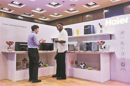 中國家電企業(yè)海爾集團旗下子公司海爾智家近日在南非最大城市約翰內(nèi)斯堡舉行產(chǎn)品發(fā)布活動,宣布正式進入南非市場。南非豪登省政府執(zhí)委會成員武伊斯瓦·拉莫豪帕在活動上表示,中國企業(yè)的投資正有力推動南非工業(yè)化進程及制造業(yè)轉(zhuǎn)型升級。圖為近日,一名男子在南非約翰內(nèi)斯堡舉行的海爾集團旗下子公司海爾智家產(chǎn)品發(fā)布活動上咨詢。