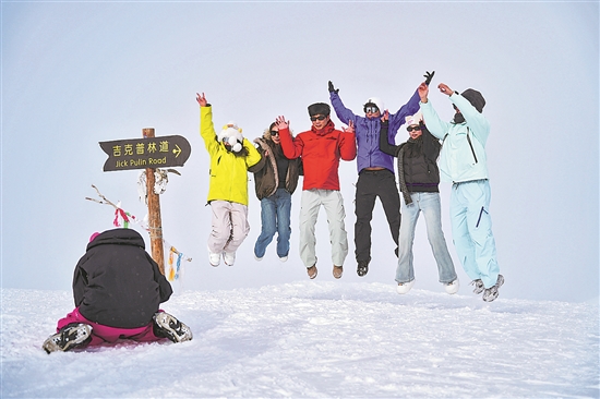 2月4日,滑雪愛好者在新疆阿勒泰地區禾木吉克普林國際滑雪度假區拍照留念。