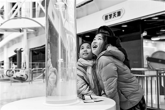 2月6日,小朋友在江蘇泰州科技館體驗科學實驗裝置。
