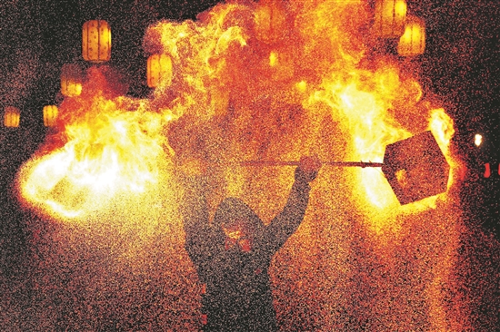 2月10日晚,民間藝人在山東省棗莊市中興國家礦山公園表演非遺“火壺”。