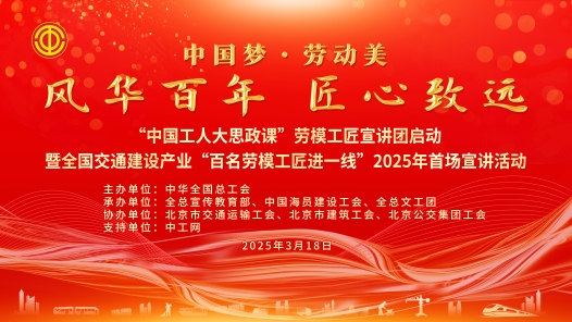 “中國工人大思政課”勞模工匠宣講團啟動暨全國交通建設產業“百名勞模工匠進一線”2025年首場宣講活動于3月18日15:30,在職工之家APP、中工網等媒體平臺進行全程直播。本次活動由全國總工會主辦,全總宣傳教育部、中國海員建設工會、全總文工團承辦,北京市交通運輸工會、北京市建筑工會、北京公交集團工會協辦。本次活動邀請5位交通建設系統勞模工匠代表進行主題宣講,全總文工團和北京公交集團職工藝術團帶來精彩紛呈的文藝節目。