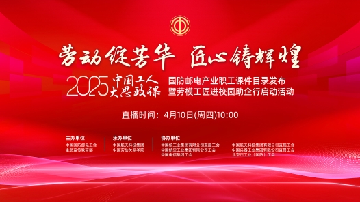 為深入貫徹《中共中央國務院關于深化產業工人隊伍建設改革的意見》,貫徹落實全總十八屆三次執委會精神和創新實施“559”工作部署,落實《關于創新打造“中國工人大思政課”的工作方案》要求,中國國防郵電工會、全總宣傳教育部聯合中國航天科技集團有限公司、中國勞動關系學院于4月共同舉辦“中國工人大思政課”課件目錄發布暨2025年國防郵電產業勞模工匠進校園助企行啟動活動。4月10日10:00,中工網首頁、微博、視頻號同步播出。