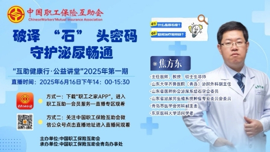6月16日是我國“泌尿健康日”,旨在科普相關知識,提高全民健康意識和科學防治水平。久坐、憋尿、喝水少、熬夜等不良生活習慣,容易誘發泌尿系結石等疾病。山東大學齊魯醫院(青島)泌尿外科焦方東教授親臨直播間,科普相關知識,提高全民健康意識和科學防治水平。2025年6月16日14:00-15:30中工網首頁、微博、視頻號同步播出。