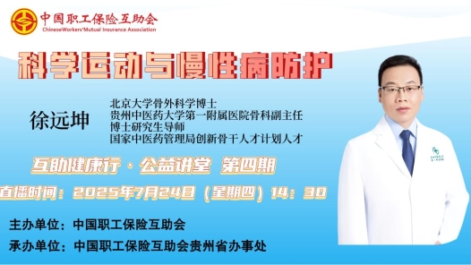 ?2025年7月24日(周四)下午14:30至16:00,由中國職工保險互助會主辦、中互會貴州省辦事處承辦的2025年第四期“互助健康行?公益講堂”——《科學運動與慢性病防護》,開啟線上直播。本期“互助健康行·公益講堂”線上直播活動邀請貴州中醫藥大學第一附屬醫院骨科副主任,教授 、博士研究生導師,國家中醫藥管理局創新骨干人才計劃人才,貴州中醫藥大學第一附屬醫院中醫骨傷科后備學科帶頭人,世界中醫藥聯合會骨傷分會常委,貴州省醫學會骨科學第十三屆委員會委員,世界數字骨科學會中華數字骨科學會貴州分會第一屆委員徐遠坤教授,和職工會員們聊一聊科學運動和慢性病防護之間的關系,如何通過科學運動有效降低慢性病發病風險,顯著提高生活質量。中工網首頁、微博、抖音號同步播出。