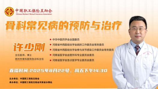 8月22日(周五)14:30至16:00,由中國職工保險互助會主辦、中互會河南省辦事處承辦的2025年第五期“互助健康行?公益講堂”——《骨科常見病的預防與治療》,開啟線上直播。本期“互助健康行?公益講堂”線上直播活動邀請鄭州市骨科醫院急診科主任、中華中醫藥學會全國委員、河南省中西醫結合學會肩肘工作委員會常務委員、河南省中西醫結合學會骨與關節感染工作委員會常務委員、河南省醫學會血管外科專業委員會委員、河南省醫學會急診醫學專業委員會委員專家許少剛博士,和職工會員們聊一聊骨科常見病的預防與治療。中工網首頁、微博、視頻號同步播出,歡迎廣大職工網友在線收看直播!