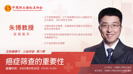 8月29日(周五)上午10:00至11:30,由中國職工保險互助會主辦、中國職工保險互助會沈陽辦事處承辦的2025年第六期“互助健康行?公益講堂”——《癌癥篩查的重要性》,開啟線上直播。本期“互助健康行?公益講堂”線上直播活動邀請遼寧省腫瘤醫院暨大連理工大學附屬腫瘤醫院、遼寧省腫瘤防治辦公室副主任,主任醫師、碩士研究生導師,中華預防醫學會癌癥篩查早診專業委員會常務委員兼副秘書長,中國抗癌協會胃癌、乳腺癌和肝癌整合防篩專業委員會常務委員,遼寧省抗癌協會理事朱博教授,和職工會員們聊一聊什么是癌癥篩查,篩查在癌癥三早預防中的重要作用。