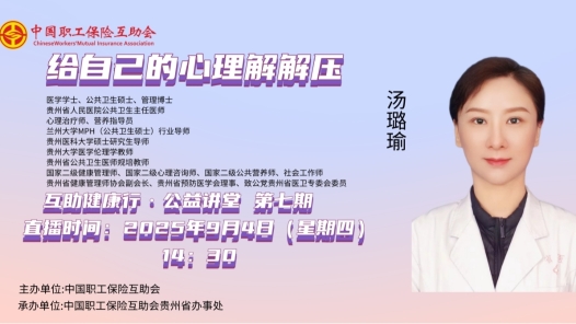 親愛的職工朋友們,是否有時候被工作壓得喘不過氣?有沒有被焦慮纏得夜不能寐?別讓壓力成為生活的“隱形負擔”!這場“給自己的心理解解壓”科普講座,帶您拆解壓力密碼,學會給情緒松綁,用科學方法幫您讀懂壓力、對抗壓力,解鎖更從容的生活方式!2025年9月4日(周四)下午14:30至16:00,由中國職工保險互助會主辦、中互會貴州省辦事處承辦的2025年第七期“互助健康行·公益講堂”——《給自己的心理解解壓》,開啟線上直播。本期“互助健康行·公益講堂”線上直播活動邀請了醫學學士、公共衛生碩士、管理博士,貴州省人民醫院公共衛生主任醫師、心理治療師、營養指導員,蘭州大學MPH(公共衛生碩士)行業導師,貴州醫科大學碩士研究生導師,貴州大學醫學倫理學教師,貴州省公共衛生醫師規培教師,國家二級健康管理師、國家二級心理咨詢師、國家二級公共營養師、社會工作師,貴州省健康管理師協會副會長,貴州省預防醫學會理事、致公黨貴州省醫衛專委會委員湯璐瑜老師,和職工會員們聊一聊如何多途徑通過科學有效的方式降低心理壓力,學習實用心理調節技巧,讓心理能量做到“待機一整天”。中工網首頁、微博、視頻號同步播出,歡迎廣大職工網友在線收看直播!
