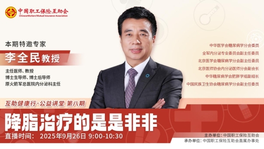 親愛的職工朋友們,您是否關注過自己的血脂報告?面對“高脂血癥”的診斷,您是否有所困惑? 血脂與內分泌系統息息相關,科學管理血脂是維護全身健康的重要一環。為幫助大家科學認識血脂異常、厘清降脂治療的常見誤區、掌握血脂管理策略,中國職工保險互助會特主辦2025年第八期“互助健康行·公益講堂——《降脂治療的是是非非》”,開啟線上直播。本期活動由中國職工保險互助會直屬辦事處承辦,特別邀請內分泌代謝領域權威專家,帶您深入探討“降脂治療的是是非非”,從專業角度解讀指南、分析利弊,為您提供基于內分泌代謝特點的個體化血脂管理建議,助您做出明智的健康選擇!