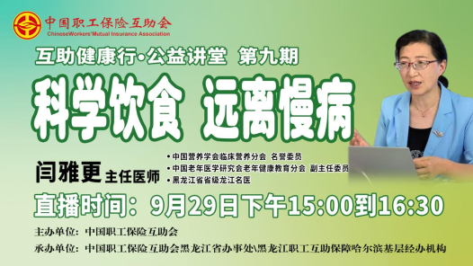 9月29日(周一)下午15:00到16:30,由中國職工保險互助會主辦、中互會黑龍江省辦事處和黑龍江職工互助保障哈爾濱基層經辦機構承辦的2025年第九期“互助健康行?公益講堂”——《科學飲食 遠離慢病》,開啟線上直播。 本期“互助健康行?公益講堂”線上直播活動邀請哈爾濱醫科大學附屬第一醫院臨床營養科主任、中國營養學會臨床營養分會名譽委員、中國老年醫學研究會老年健康教育分會副主任委員、黑龍江省省級龍江名醫、中國醫師協會營養醫師專業委員會委員、黑龍江省醫學會腫瘤營養代謝與治療專業委員會副主任委員、黑龍江省糖尿病教育學會副會長閆雅更,和職工會員們聊一聊科學飲食肯遠離慢病。中工網首頁、微博、視頻號同步播出。 ?