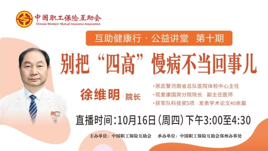 10月16日(周四)下午3:00至4:30,由中國職工保險互助會主辦、中互會鄭州辦事處承辦的2025年第十期“互助健康行?公益講堂”——《別把“四高”慢病不當回事兒》,開啟線上直播。本期“互助健康行?公益講堂”線上直播活動邀請原武警河南省總隊醫院體檢中心主任,現愛康國賓體檢醫院分院長、副主任醫師徐維明,和職工會員們聊一聊高血壓、高血脂、高血糖、高尿酸“四高”慢病的全面管理。中工網首頁、微博、抖音號同步播出。