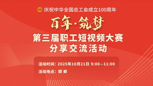 10月21日(周二)上午9:00至11:00,由中華全國總工會宣傳教育部、網絡工作部指導,工人日報社、中工網聯合主辦,河北省邯鄲市總工會承辦的“百年·筑夢”第三屆職工短視頻大賽分享交流活動,在河北省邯鄲市開啟線上直播。獲獎代表、職工短視頻達人等嘉賓與大家交流創作心得,并邀請專家進行現場點評。人民日報視頻客戶端“視界”,全國總工會視頻號、抖音號,工人日報視頻號、抖音號,中工網PC端、視頻號、抖音號等平臺同步直播。歡迎廣大職工觀看直播,共赴這場屬于職工的視聽盛宴!