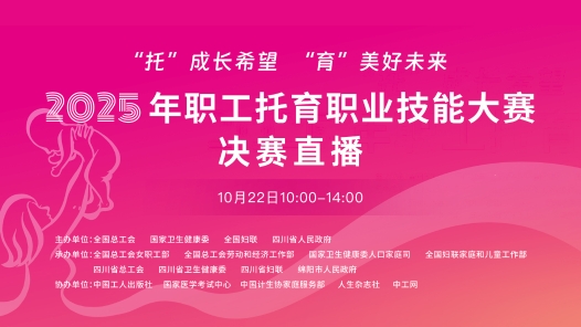 2025年職工托育職業技能大賽決賽于10月21日至24日在四川省綿陽市中國科技城會議展覽中心舉行。本次大賽由全國總工會、國家衛生健康委、全國婦聯、四川省人民政府共同主辦,旨在加強托育服務人才隊伍建設,推動普惠托育服務體系發展。大賽以“‘托’成長希望‘育’美好未來”為主題,設置“嬰幼兒發展引導員”與“保育師”兩個工種。全國各省(區、市)及新疆生產建設兵團32支代表隊參賽。10月22日10:00,中工網首頁、微博、視頻號同步播出。