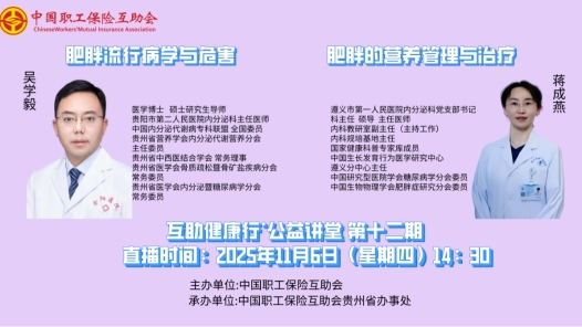 2025年11月6日(周四)下午14:30至16:00,由中國職工保險互助會主辦、中互會貴州省辦事處承辦的2025年第十二期“互助健康行·公益講堂”開講啦!這場肥胖專題公益講堂,專門邀請了遵義市第一人民醫院內分泌科黨支部書記、科主任、碩導、主任醫師蔣成燕主任以及貴陽市第二人民醫院內分泌科主任醫師、醫學博士 、碩士研究生導師吳學毅主任為我們分別講解《肥胖的營養管理與治療》、《肥胖流行病學與危害》兩個課題。為積極響應國家“健康中國2030”戰略,落實“體重管理年”三年行動,讓職工朋友們搞懂 “為什么會胖”“胖了到底有多傷身體”“怎么才能健康瘦不反彈”,本期公益講堂將帶您徹底跳出減肥誤區,掌握科學管理體重的核心邏輯,從餐桌到生活,從身體到心靈,開啟健康生活新篇章!中工網首頁、微博、視頻號同步播出。