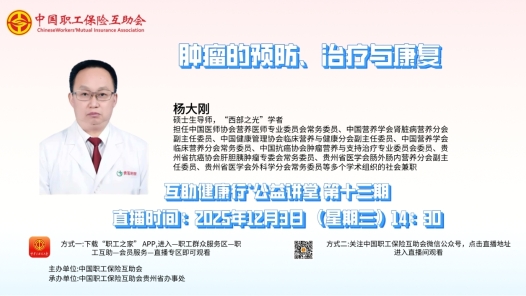 2025年12月3日(周三)下午14:30至16:00,由中國職工保險互助會主辦、中互會貴州省辦事處承辦的2025年第十三期“互助健康行·公益講堂”——《腫瘤的預防、治療與康復》開講啦!為積極響應國家腫瘤防治戰略,讓職工朋友們真正搞懂“腫瘤怎么防”“查出腫瘤怎么辦”“術后如何科學康復”,本期公益講堂邀請貴州醫科大學附屬醫院楊大剛主任為廣大職工朋友們講解《腫瘤的預防、治療與康復》這一課題。帶您跳出腫瘤防治的認知陷阱,掌握從預防篩查到治療康復的全流程科學方法,為自己和家人筑牢健康防線!中工網首頁、微博、視頻號同步播出。