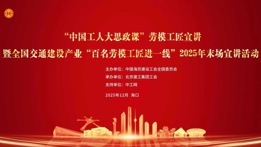 12月5日,“中國工人大思政課”勞模工匠宣講暨全國交通建設產業百名勞模工匠進一線2025年末場宣講活動在海口舉辦,旨在深入學習貫徹習近平新時代中國特色社會主義思想和黨的二十大、二十屆歷次全會精神,深入落實習近平總書記在中華全國總工會成立100周年暨全國勞動模范和先進工作者表彰大會上的講話精神,落實做強“中國工人大思政課”工作要求,突出產業特色,大力弘揚勞模精神、勞動精神、工匠精神,激勵廣大職工在新征程上再接再厲,接續奮斗,書寫工會事業時代新篇章。中工網首頁、微博、抖音號同步播出。