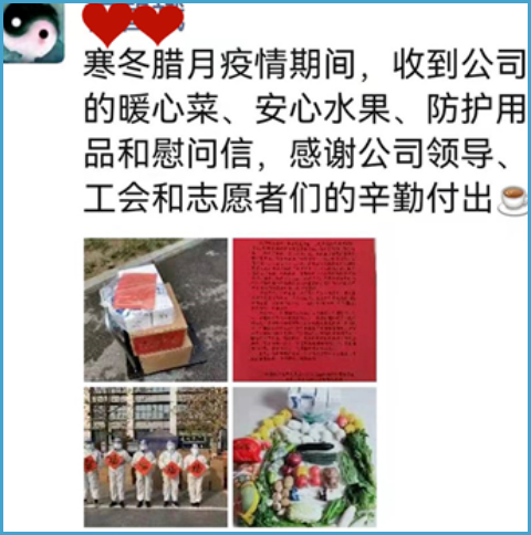 疫情期間,長慶油田各級工會主動承擔保障責任,充分發揮各單位互助聯盟作用,自2021年12月26日起,公司工會部署各二級單位先后對在西安區域居家辦公,一線在崗員工封控家屬進行摸排統計,全面了解干部員工“特殊時期”生活所需,全城“尋糧”及時“訂貨”,“疫情防控不止,工會暖心不斷”服務全面上線,連日來,承載著工會滿滿關愛的安全“糧”、放心“菜”,已經送至員工及家屬家中。